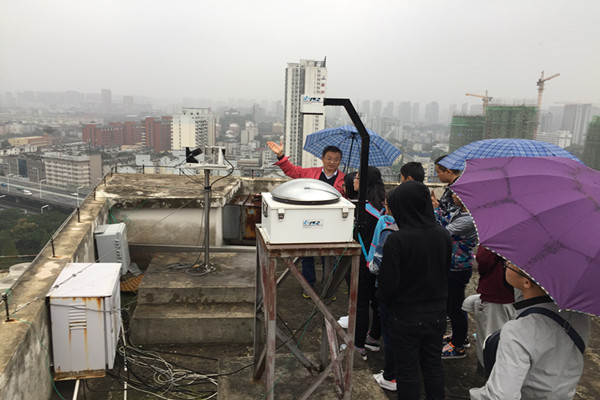 在中科大地空公司李锐教授的带领下,公司员工走进一间研究室,里面摆放着一台正在工作的仪器,它的制作者之一袁仁民副教授用通俗的语言向来访员工介绍了这台通过接受光来检测气溶胶的仪器的工作原理,并耐心的解答了员工所提的问题,包括这台仪器所使用的工作环境和核心部件,介绍完这台仪器之后,袁仁民副教授带领大家走上顶楼,参观大气监测的一些仪器,包括雨量计,能见度仪,雨雷达,和前向散射仪,使得公司员工对这些仪器有了初步的认识和了解。