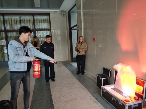 随后为了让大家实际掌握灭火器的操作使用,在科技楼一楼大厅进行了模拟火灾演练。在消防科老师们的示范指导下,大家积极动手参与操作,掌握了灭火器的“拔销子、握管子、压把子、对准”正确操作方法后,“熊熊火势”很快就被灭掉了。