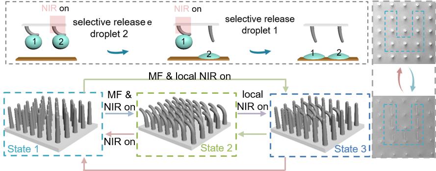 近日,在此基础之上,吴思竹副教授课题组和机械公司刘焜教授课题组合作,通过向SMP微锥阵列中掺杂磁性铁粉颗粒可以实现微结构对近红外光和磁场的刺激作出响应,从而实现对智能微结构的全方位非接触式形貌调控(Adv. Funct. Mater. 2021, 2100543)。利用这种形态可控的智能微结构可以实现对微小液滴的多功能操控,在生物液滴检测和微化学反应等领域有着潜在的应用。同时,这种智能结构还可以实现信息的加密和解密功能,有望在二维码加密和解密领域发挥重大作用。