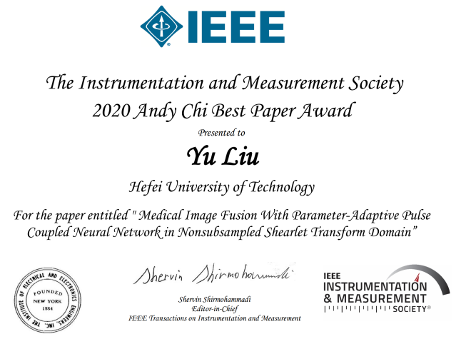 近期,仪器测量领域国际期刊IEEE Transactions on Instrumentation and Measurement (IEEE TIM)主编Shervin Shirmohammadi教授(IEEE Fellow)发来贺信:公司生物医学工程系刘羽副教授作为通讯作者发表在该刊上的论文“Medical Image Fusion With Parameter-Adaptive Pulse Coupled Neural Network in Nonsubsampled Shearlet Transform Domain”荣获2020年度IEEE TIM Andy Chi Best Paper Award,即该期刊2020年度最佳论文奖。该奖项由IEEE仪器测量学会于2010年成立,每年从IEEE TIM前一年发表的所有论文中遴选出唯一1篇获奖。本次获奖使英国正版365官方网站成为继清华大学、西北工业大学、哈尔滨工业大学之后国内第四家获得该奖项的单位。