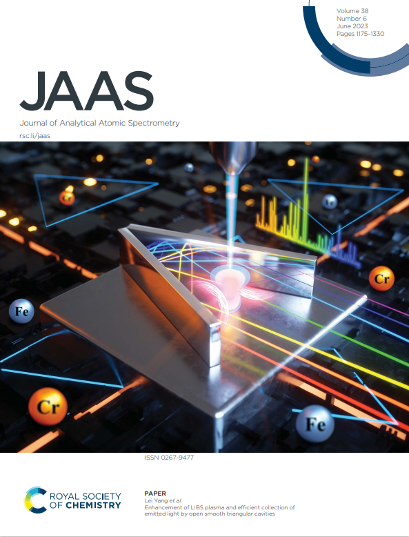 针对LIBS技术易受基体效应、仪器设备、实验环境等影响,光谱强度弱且不稳定导致检测精度低等问题,研究团队将冲击波压缩等离子体增强光谱机制和提高收集系统的光线收集效率相结合,设计了开放式光滑三角腔体增强LIBS光谱,用较低的成本有效提高了光谱稳定性、灵敏度、定量检测准确性。该文章发表在光谱学一区《Journal of Analytical Atomic Spectrometry》(2023,38(6)),并入选为封面论文。