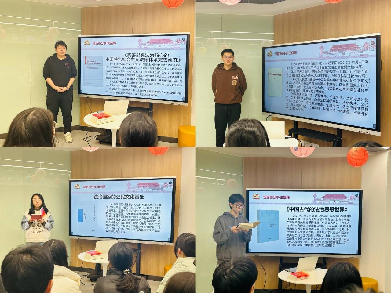 本次读书分享会分为阅读分享与交流讨论两个环节。同学们从一部部关于宪法的著作入手,既深刻阐述了新时代中国特色社会主义法律体系,又深入探讨了古代政治法制建设的起源。周翔坤分享了《完善以宪法为核心的中国特色社会主义法律体系完善研究》,讲述了中国共产党坚持走中国特色社会主义法治道路、建设中国特色社会主义法治体系的新思考与新任务;王耀正推荐了《论坚持全面依法治国》一书,以深化同学们对推进全面依法治国是国家治理的一场深刻变革的理解;朱明莉在领学了《法治国家的公民文化基础》有关内容后,从历时性和共时性的双重视角,深入分析了公民文化对于法治的重大作用;王琨程带来的《中国古代的法治思想世界》,从天道、神道、人道和君道构建中国古代政治和法制思想的基本思想讲起,通过对古代法制思想的深入研究,阐述了古代中国社会的运行机制。在交流学习讨论环节,同学们就新时代如何学好宪法,做知法、守法、懂法、用法的新时代青年展开了讨论,一致认为新时代青年应当积极弘扬宪法精神,传播法治文化。