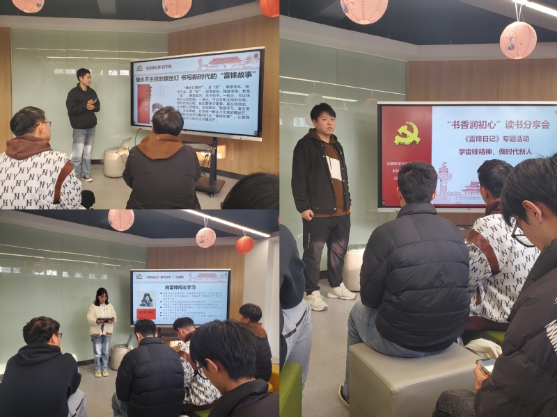 自三月初,每位党员认真阅读了《雷锋日记》,每一篇日记感人至深,还原了雷锋同志在日常工作生活中助人为乐、无私奉献,刻苦学习、积极进取的心路历程。在读书沙龙分享环节中,王谊联同学以日记中的经典话语入手,介绍了什么是雷锋精神,讲解其核心和实质就是全心全意为人民服务;王耀正同学以“学习雷锋好榜样,艰苦朴素永不忘”为主题讲述了雷锋同志的一生,他用短暂的生命留下永恒的精神;周翔坤同学从如何在学习生活中践行雷锋精神为主题,倡议同学们在任何时间、任何地点、任何岗位都应当以高度的责任意识完成学习任务和本职工作,主动担当作为,发扬“螺丝钉精神”,发挥党员的先锋模范作用。在交流讨论环节,同学们就新时代如何弘扬雷锋精神进行讨论,表示要把雷锋精神融入到自己的学习生活点滴中,把青春奋斗与雷锋精神有机结合起来,勇做实现中华民族伟大复兴的先锋力量。
