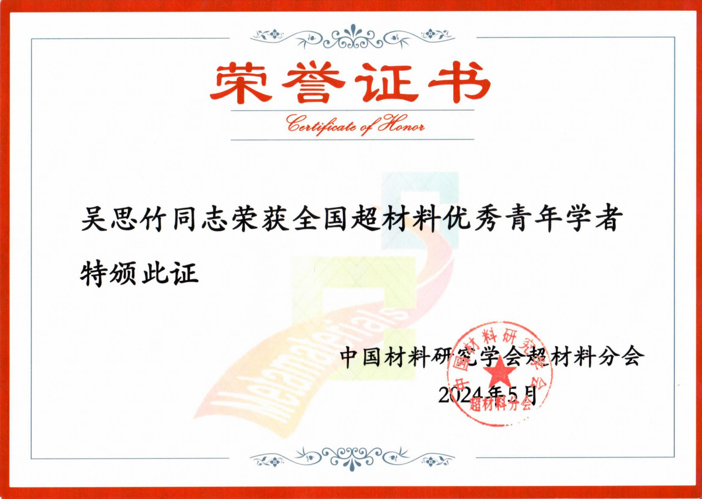 公司吴思竹教授获全国超材料优秀青年学者奖