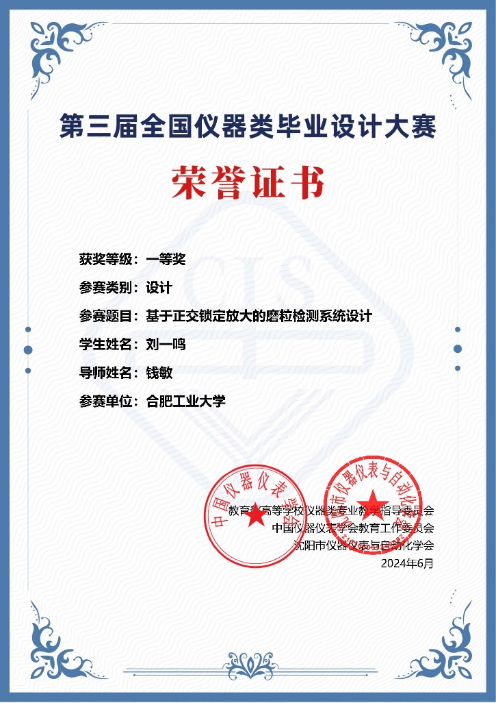 2024年5月18日至6月1日,第三届全国仪器类毕业设计大赛在贵州大学举办。经过预赛、半决赛的激烈角逐,公司英国正版365官方网站本科生刘一鸣的作品“基于正交锁定放大的磨粒检测系统设计”(指导教师:钱敏)从来自全国28个省份132所高校的567篇毕业设计(论文)中脱颖而出,在全国决赛中荣获一等奖。