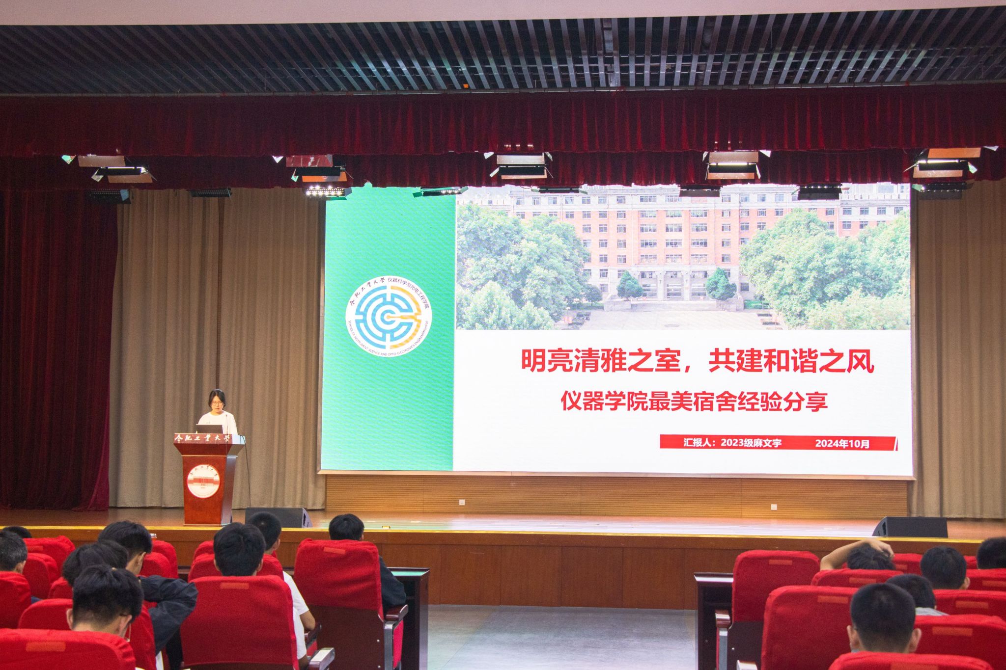 “最美宿舍”获奖代表、2023级员工麻文宇以《明亮清雅之室,共建和谐之风》为题,从寝室文化设计理念、寝室文化内涵建设内涵、宿舍建设目标与成效等方面做经验分享,倡导同学们发扬劳动精神,参与劳动实践,将寝室打造成温馨和谐之家,在劳动中感受友谊和温暖。