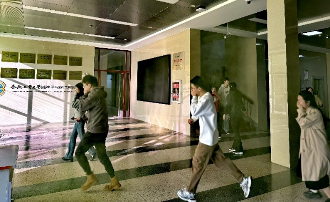 随后,公司会同消防科、物业在科技楼组织开展了应急疏散演练。为了顺利完成本次消防演练,公司提前就演练的各项事宜作了部署安排,并制定了详细的“科技楼一楼一案”消防演练活动流程,确保演练当天分工明确,职责清楚。演练现场,公司党委书记李军鹏首先通过消防广播发布了演练动员令,宣布疏散逃生演练正式开始,演练流程有序拉开:模拟烟雾在楼内点燃,灾警报响起,全体师生迅速做出反应,在楼层引导员的指挥下,各楼人员按照预定的疏散路线,弯腰低姿、用手帕或衣袖捂住口鼻,快速而有序地从楼内疏散至一楼宽阔的安全地带。整个疏散过程仅用时不到8分钟,做到了快速、安全、有序,充分展现了师生们良好的应急素质。