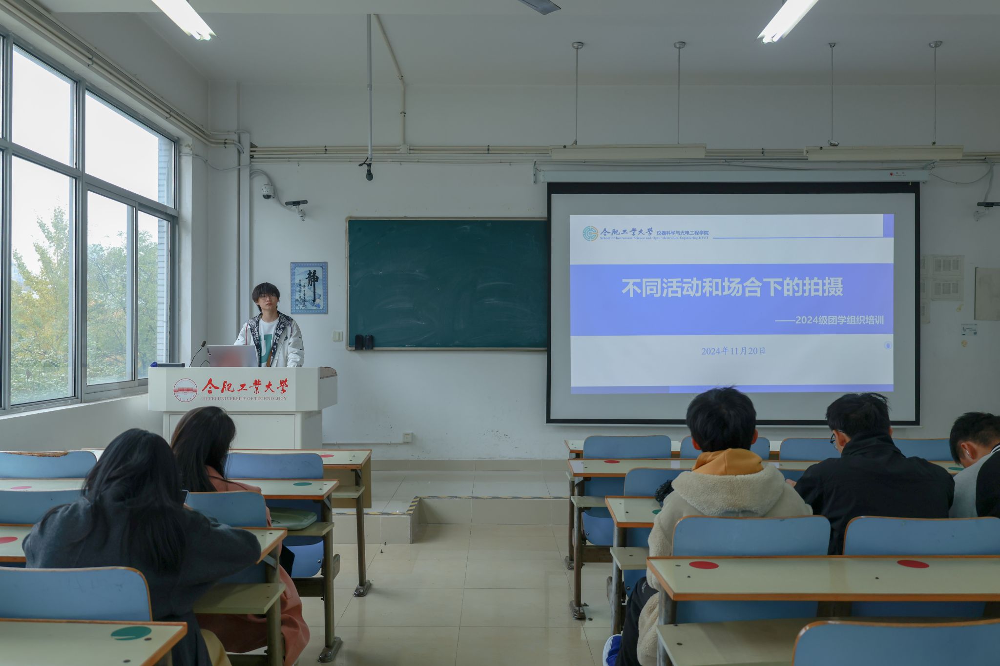本次培训邀请了2023级新媒体中心负责人叶昊文担任主讲人,他由基础入手,围绕摄影技巧,首先讲解了照相机的基本构造、工作原理以及合适的相机选择。随后阐述了拍照目标的选择,他说工具是其次,拍摄的关键是要表达的思想。他又提到拍摄要注意题材的选择和拍摄表达的手法,弄清这两点,我们就可以琢磨如何把自己的照片拍好。最后,他结合工作实际,详细讲解了不同类型的活动照片的拍摄标准和要求,并从专业的角度给大家说明了光圈、快门和感光度(ISO)这三个重要参数对相机成像的影响,以及如何调节合适的色温与白平衡使照片达到同学们的要求,众多干货让同学们受益匪浅。