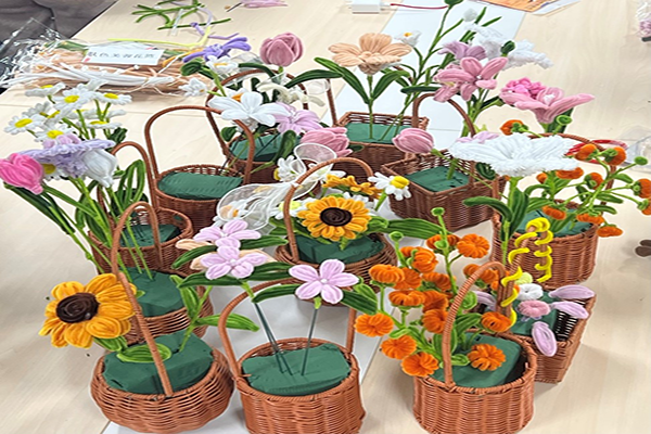 活动现场,公司精心布置了温馨的创作空间,准备了彩虹色系扭扭棒、花艺铁丝、装饰彩珠等专业手工材料。在志愿者的示范引导下,参与者们从基础技法学起,逐步掌握花瓣塑形、花枝缠绕、花束组合等编织技巧。同学们充分发挥创意,将普通的彩色金属丝幻化成玫瑰、牡丹、郁金香等花卉造型。