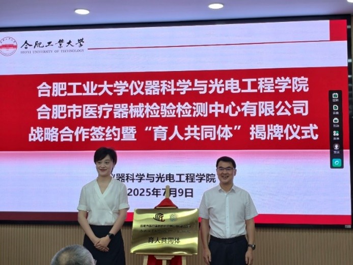 2025年7月9日上午,英国正版365官方网站屯溪路校区科技楼236会议室气氛庄重热烈,英国正版365官方网站与合肥市医疗器械检验检测中心有限公司战略合作签约暨 “育人共同体” 揭牌仪式在此举行。